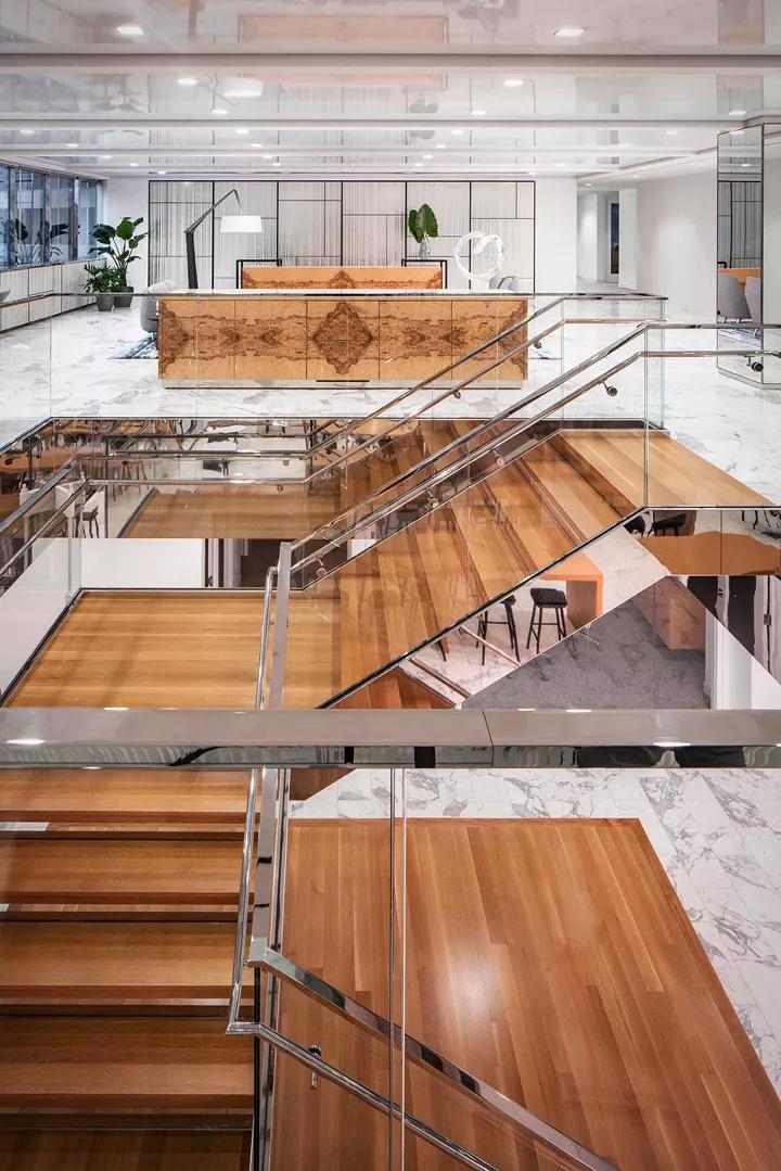 室內(nèi)裝修以通透的玻璃來制作隔墻,利于光和視線的穿透。黃褐色樹瘤橡木飾面板制作的接待前臺也是本案的一大看點,均衡對稱的蝴蝶紋樣的木紋圖形帶來戲劇化的視覺效果,猶如一張代表公司形象的藝術名片,令人為之驚嘆。